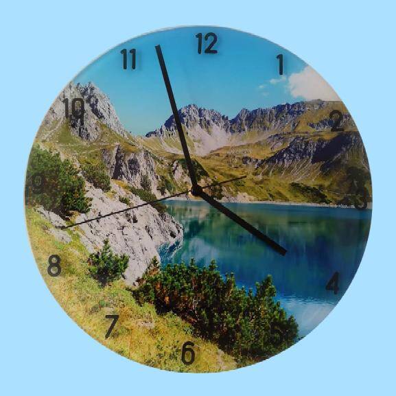Wanduhr mit Fotomotiv jeder Art. Egal ob Landschaftsbilder, Familienbilder oder Bilder Ihrer Liebsten. Uhr aus hochwertigem Epoxitharz mit Quarzuhrwerk. Beschriftung ist in neutraler Gestaltung gehalten. Durchmesser 30cm.